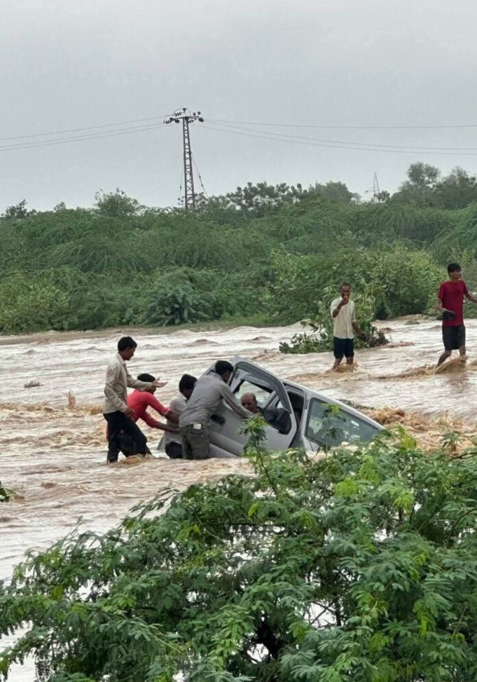 जालोर जिलेभर में मूसलाधार बारिश का दौर जारी है। तेज बारिश के चलते नदी नालों में भी पानी की तेजी से आवक बढ़ रही है। भीनमाल से 8 किमी दूरी से चलने वाली रोपसी नदी की रपट पर तेज बारिश के कारण पानी बहने लगा है। गुरुवार दोपहर को रपट पर तेज बहाव में एक ईको कार बह गई। जानकारी के अनुसार चौराऊ निवासी कालूसिंह ईको गाड़ी में करड़ा से भीनमाल की तरफ जा रहे थे। इस दौरान बहाव में उन्होंने गाड़ी डाल दी तो पानी के साथ बह गई। इस दौरान वहां मौके पर खड़े पुलिसकर्मी व ग्रामीणों ने बड़ी मशक्कत के बाद कालूसिंह को बाहर निकाला।