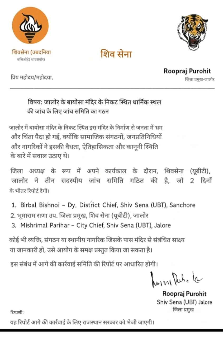 कमेटी में जिला सांचौर के जिला उप प्रमुख बीरबल विश्नोई, जालोर के जिला उप प्रमुख भूमाराम राणा व जालोर शहर के नगर प्रमुख मिश्रीमल परिहार को शामिल किया है। पुरोहित ने बताया कि हकीकत क्या मामला है, उसके बाद इस मामले को शिवसेना राजस्थान सरकार को आगे की कार्रवाई के लिए मांग करेंगी।