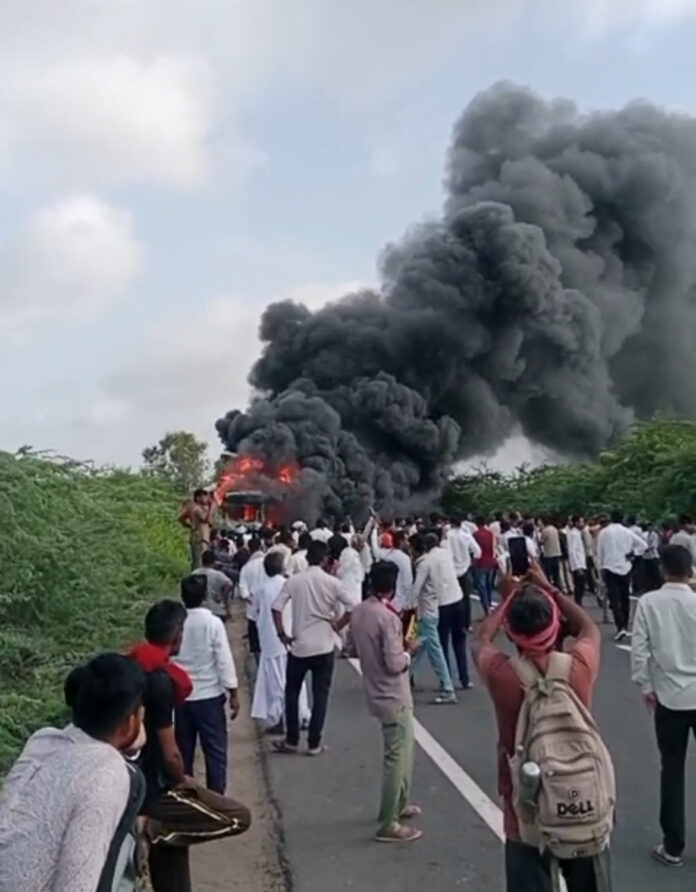 जानकारी के अनुसार गुजरात से रामदेवरा जा रहे 2 यात्री बस की चपेट में आ गए। हादसे के बाद बस में आग लगी। इस आग ने दोनों यात्रियों को घेर लिया एवं जिंदा जल गया। सूचना पर पुलिस व दमकल के वाहनों ने मौके पर पहुंचकर आग को काबू किया। हालांकि बस पूरी तरीके से जलकर राख हो गई।